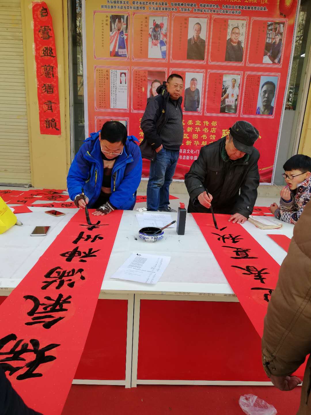 2月4日-5日,祥符區(qū)店舉辦了為期兩天的“書法名家義寫春聯(lián)”活動;顒庸惭埵 ⑹屑墪▍f(xié)會會員10名,分別在祥符區(qū)連鎖店和新華超市門前鋪案揮毫;顒蝇F(xiàn)場人頭攢動,熱鬧非凡。一副副春聯(lián)在叫好聲中完成,一會兒功夫地上就鋪滿了紅紅火火的春聯(lián),排隊等候領(lǐng)取春聯(lián)的讀者絡繹不絕。為期兩天的活動,共為讀者書寫春聯(lián)400余幅。