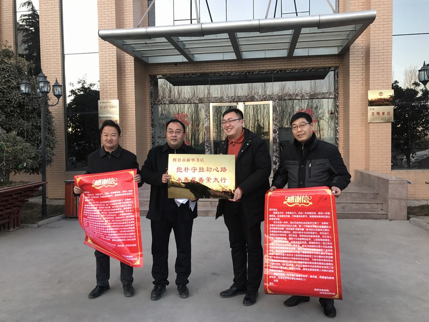 近日,輝縣市教育局副局長(zhǎng)王琪一行代表教育局黨委來(lái)到輝縣市店,他們給該店送來(lái)了一個(gè)抱樸守拙初心路,書(shū)香花香熏太行并送來(lái)感謝信一封,充分肯定了輝縣市店2017年的工作,并對(duì)店多年來(lái)對(duì)教育工作的支持表示感謝。這是輝縣市教育局連續(xù)三年給該店送來(lái)牌匾和感謝信。