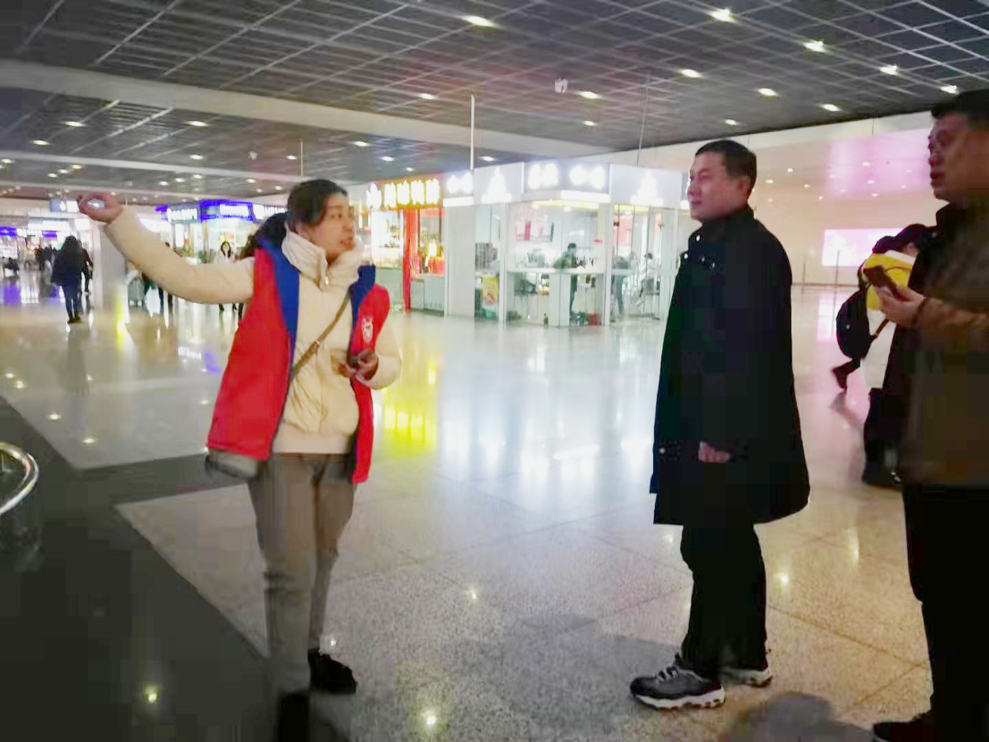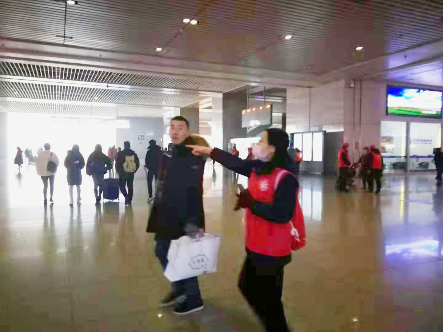 鄭州高鐵站一樓大廳樓層很高,東西南北四個(gè)方向有多個(gè)出入口,大門敞開,而且一樓大廳沒(méi)有供暖,冷風(fēng)嗖嗖,似乎比室外還要冷,但是,參加活動(dòng)的志愿者們?yōu)檫^(guò)往旅客提供的無(wú)私幫助,從而收獲了被助者由衷的謝意和回報(bào)的微笑,他們的內(nèi)心不由得也暖和了起來(lái)…… |