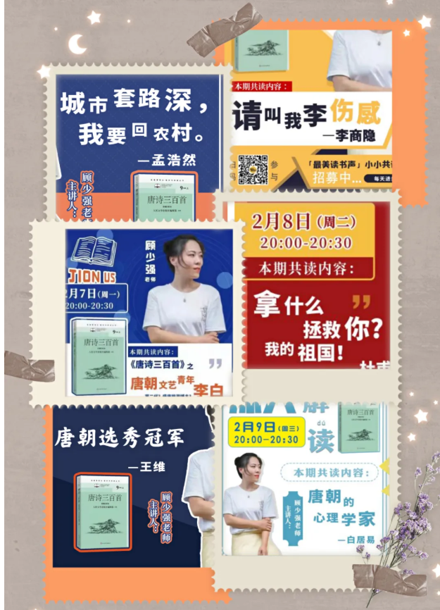 我們共同學(xué)習(xí)了“我拿什么拯救你?我的祖國!——杜甫”“唐朝的心理學(xué)家——白居”“城市套路深,我要回農(nóng)村——孟浩然”“唐朝選秀冠軍——王維”等精彩的精讀內(nèi)容。