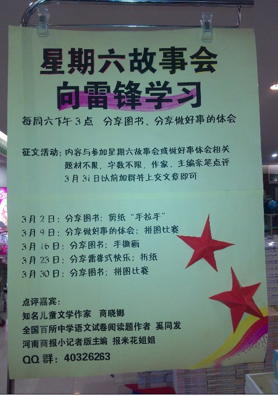 伴隨著春節(jié)長假的遠去,三月份如期而至,同時該月又是學(xué)雷鋒月,鄭州市店為大力弘揚雷鋒精神,充分利用自身營銷品牌——“星期六故事會”這一平臺,開展為期一個月的“向雷鋒學(xué)習(xí)”主題活動。