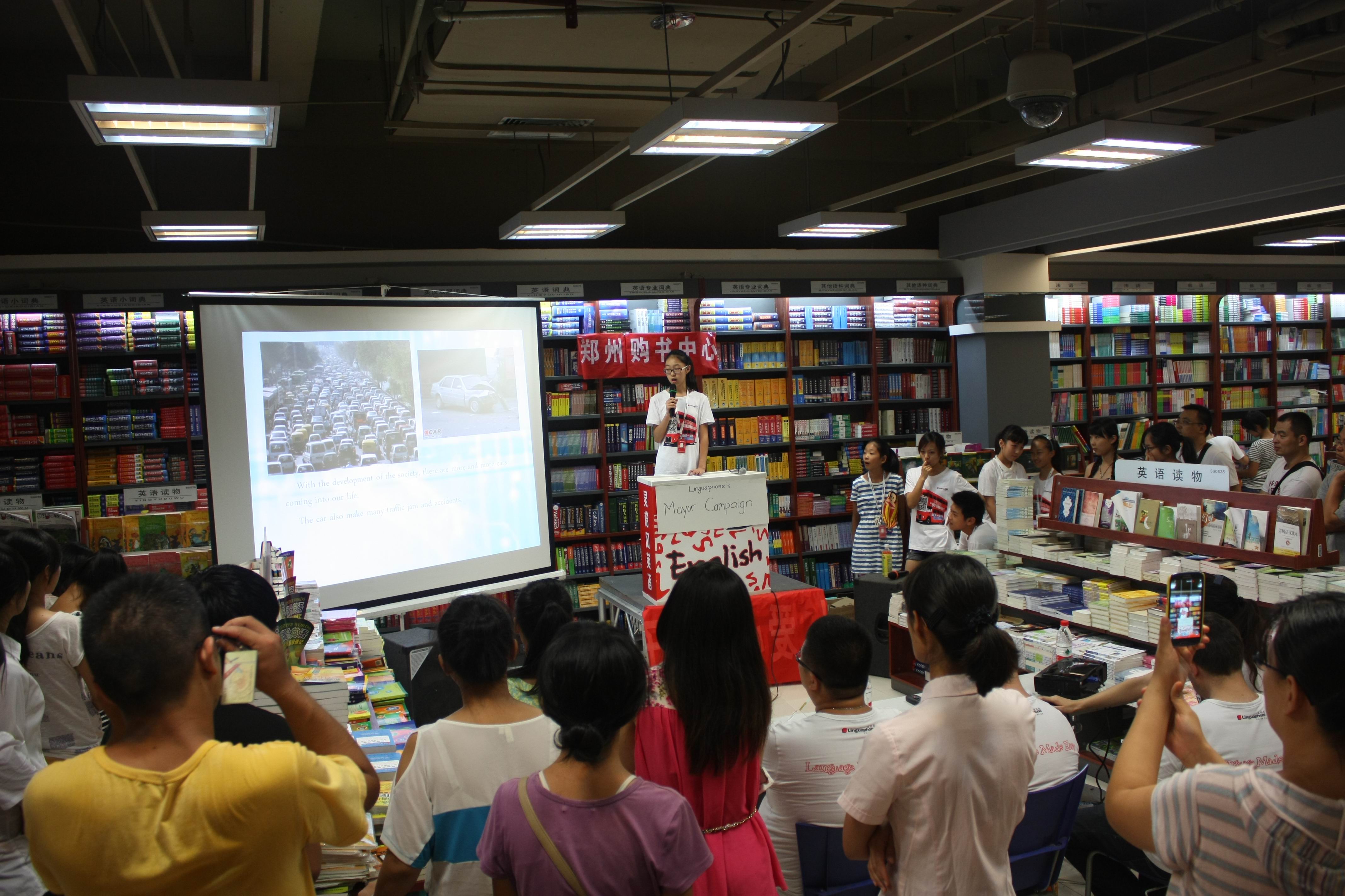 為回饋廣大外語(yǔ)愛(ài)好者的厚愛(ài),日前鄭州市店外語(yǔ)角活動(dòng)如期舉辦。本次活動(dòng)采用演講比賽的形式,規(guī)定以“市長(zhǎng)競(jìng)選”為主題,在鄭州市店購(gòu)書(shū)中心三樓外文書(shū)店內(nèi)開(kāi)辟場(chǎng)地,搭設(shè)演講臺(tái),配備投影儀及音響設(shè)備,并特別邀請(qǐng)了“靈格風(fēng)”外語(yǔ)培訓(xùn)機(jī)構(gòu)的專(zhuān)業(yè)外教擔(dān)任評(píng)委。活動(dòng)當(dāng)天,選手們精神飽滿(mǎn),準(zhǔn)備充分,以流利的英語(yǔ)口語(yǔ)和抑揚(yáng)頓挫的語(yǔ)調(diào)博得現(xiàn)場(chǎng)陣陣掌聲,同時(shí)活動(dòng)也吸引了眾多讀者的圍觀和參與,大家紛紛踴躍地對(duì)參賽選手進(jìn)行互動(dòng)投票,最后該店工作人員對(duì)專(zhuān)家和大眾評(píng)審的結(jié)果進(jìn)行了匯總,現(xiàn)場(chǎng)公布了參賽選手的獲獎(jiǎng)名次,并為他們頒發(fā)了精心準(zhǔn)備的獎(jiǎng)品。
