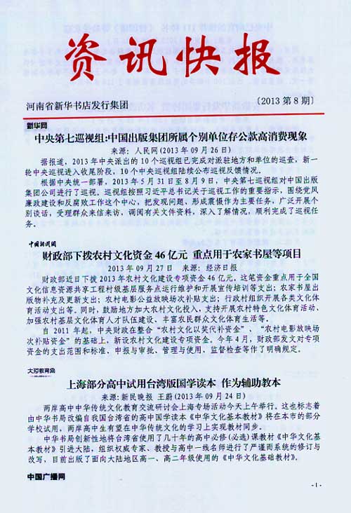 來源:河南省新華書店發(fā)行集團有限公司  作者:河南省新華書店發(fā)行集團有限公司  發(fā)布時間:2013/9/27 14:16:17  閱讀次數:5802