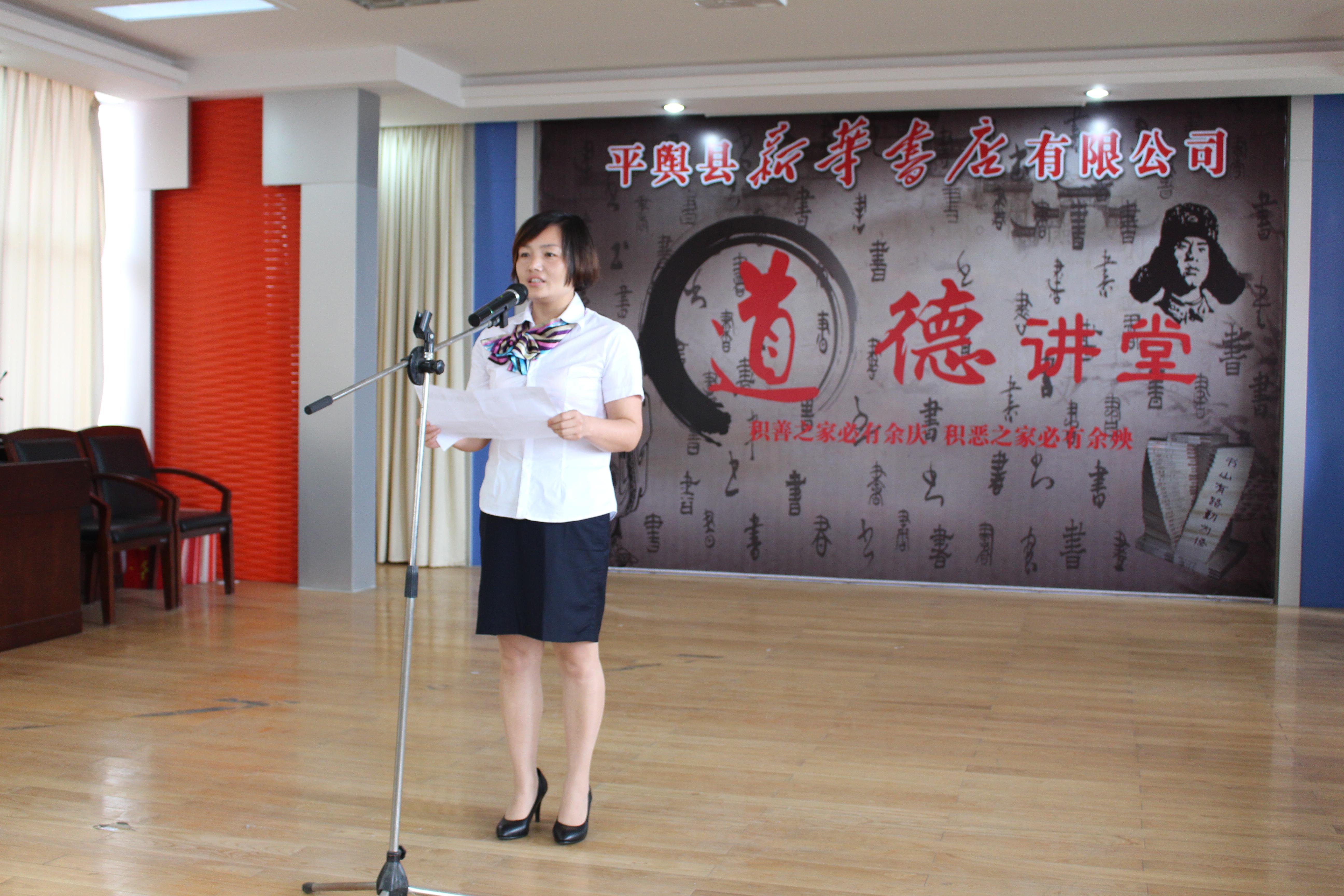 為進(jìn)一步提升道德素養(yǎng),弘揚(yáng)中華民族優(yōu)秀文化、傳統(tǒng)美德和時(shí)代精神,促進(jìn)干部、職工文明素質(zhì)提高。7月24日上午,平輿縣店隆重舉行“道德大講堂”活動(dòng),倡導(dǎo)道德之風(fēng)、傳遞文明風(fēng)尚,打造和諧書(shū)店,展現(xiàn)平輿縣新華人的凝神聚力、團(tuán)結(jié)奮進(jìn)、傳遞愛(ài)心、無(wú)私奉獻(xiàn)的良好精神風(fēng)貌。我店干部職工六十多人參加了活動(dòng)。